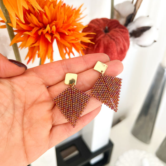 Colier la baza gatului cu triunghiuri tesute din margele negre, bronz si portocaliu chihlimbar