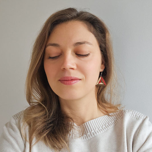 Cercei triunghiulari cu model geometric din margele rosii, crem si maro