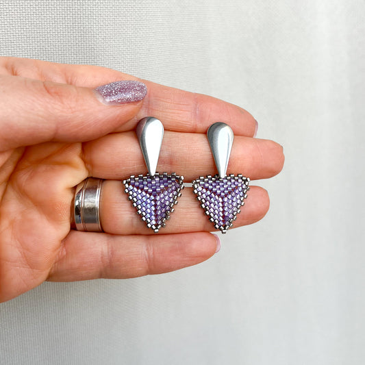 Cercei triunghiulari eleganti mici din margele mov stralucitor si argintii