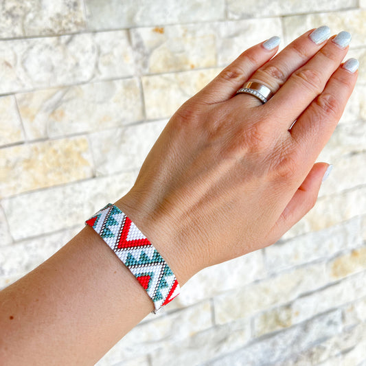 Bratara etno din margele albe, rosii, si turcoaz