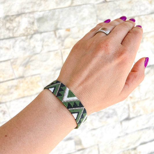 Bratara tesuta din margele cu triunghiuri oliv