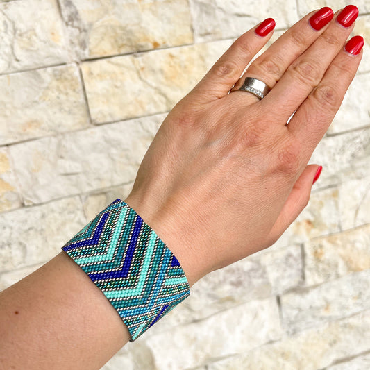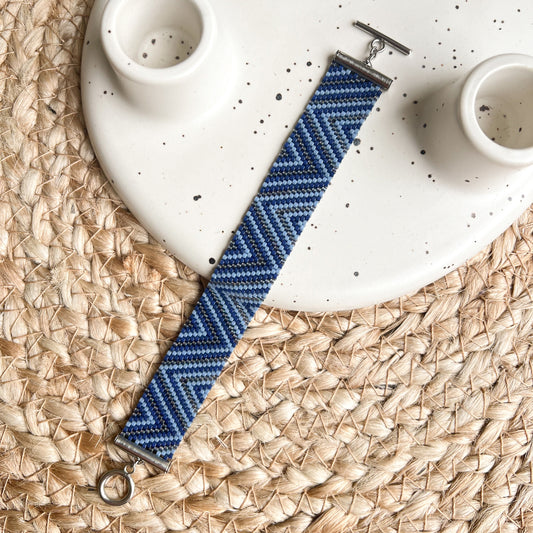 Bratara zig zag tesuta din margele in nuante albastru denim