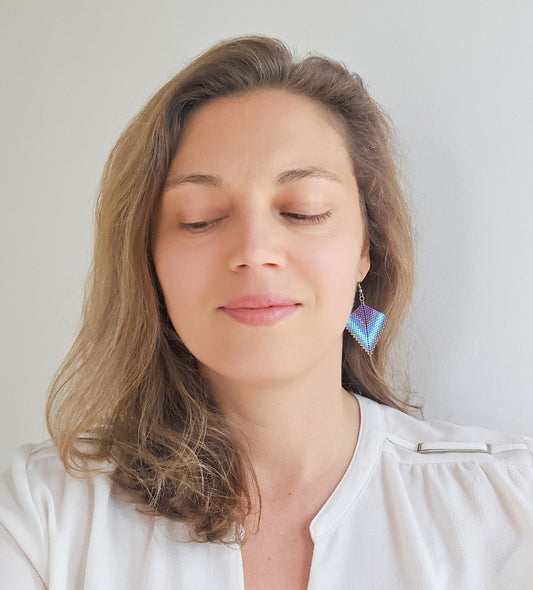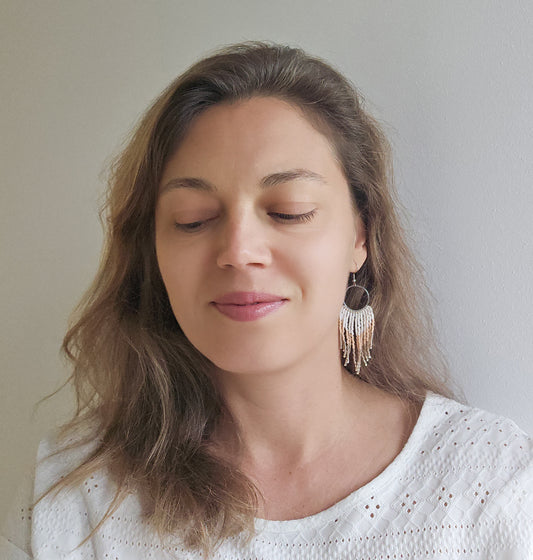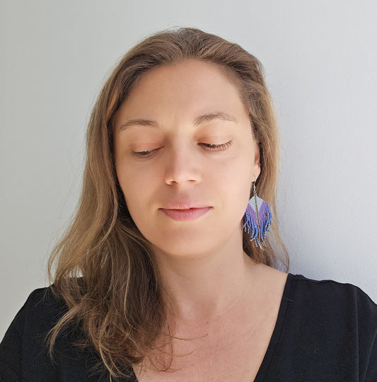 Cercei boho cu franjuri din margele mov, albastre si gri deschis