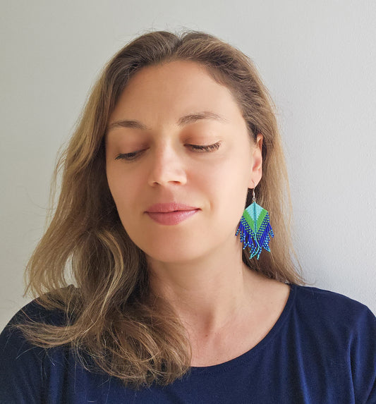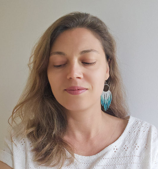 Cercei boho cu franjuri din margele turcoaz, albastre si verzi