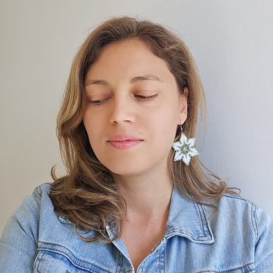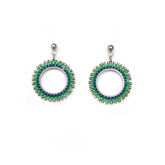 Cercei cercuri cu surub din margele verzi, bleumarin si argintii