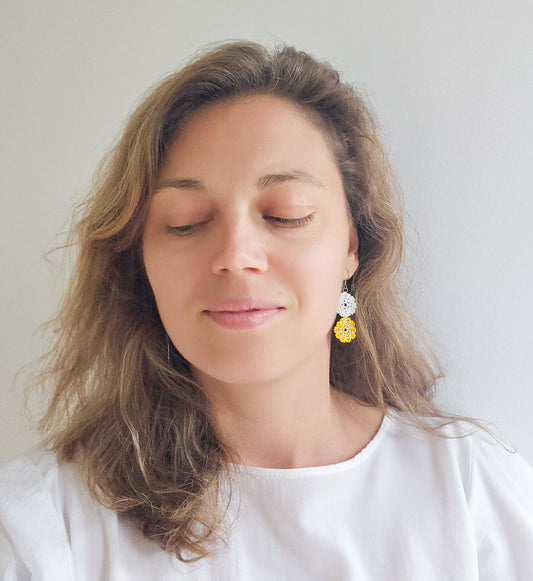Cercei triunghiulari din margele crem, roz somon si aurii