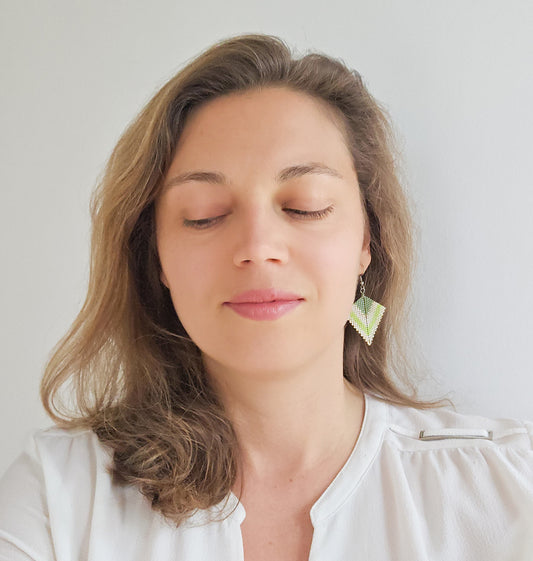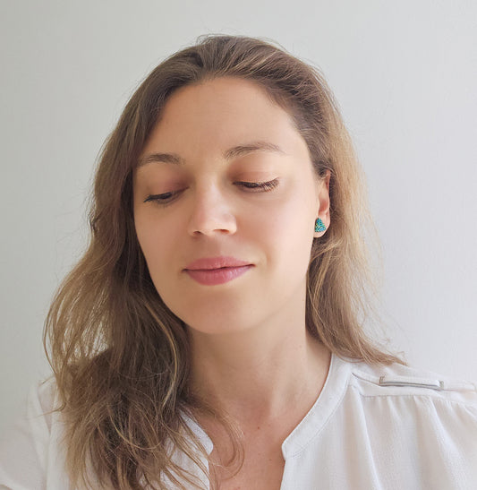 Cercei triunghiulari mici verde turcoaz cu reflexii multicolore