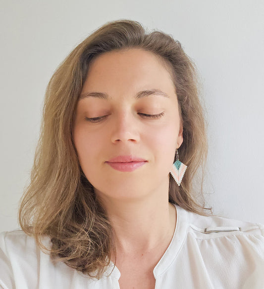 Cercei geometrici din margele turcoaz, roz somon si crem