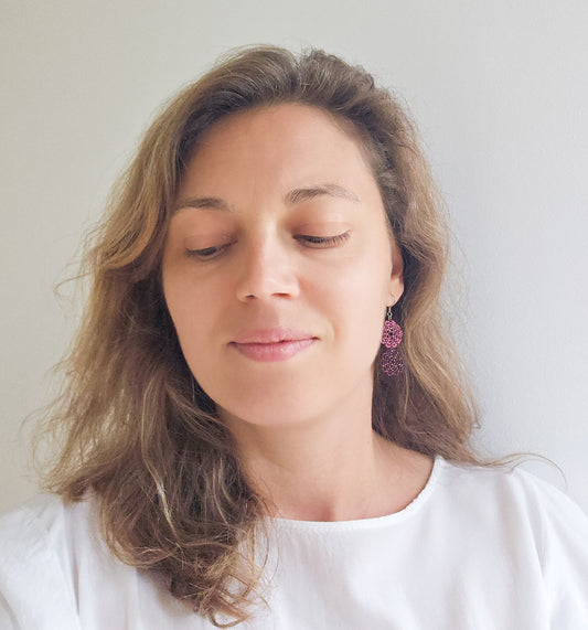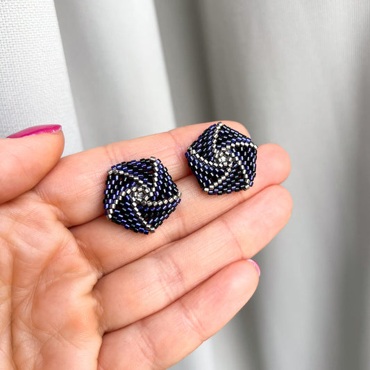 Cercei spirala din margele negre, argintii si mov indigo metalizat