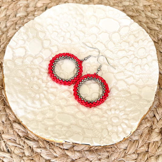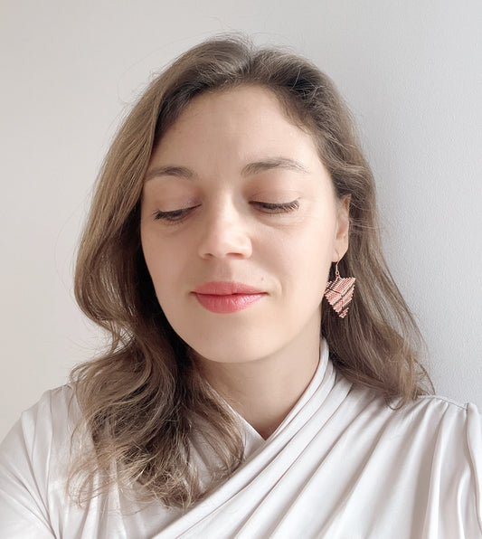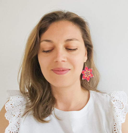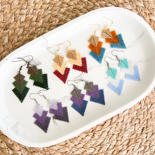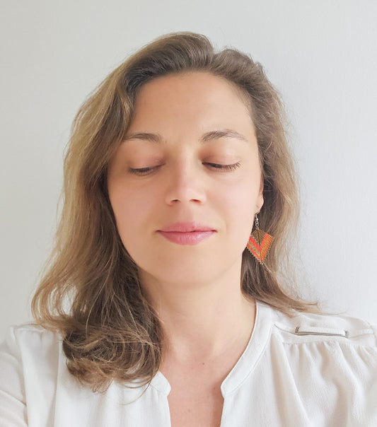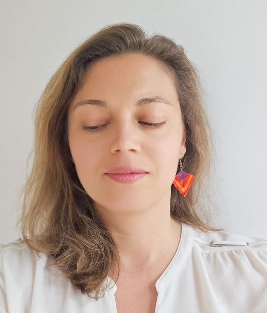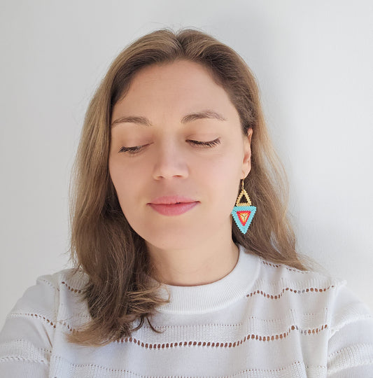 Cercei geometrici triunghiulari din margele turcoaz, rosii si aurii