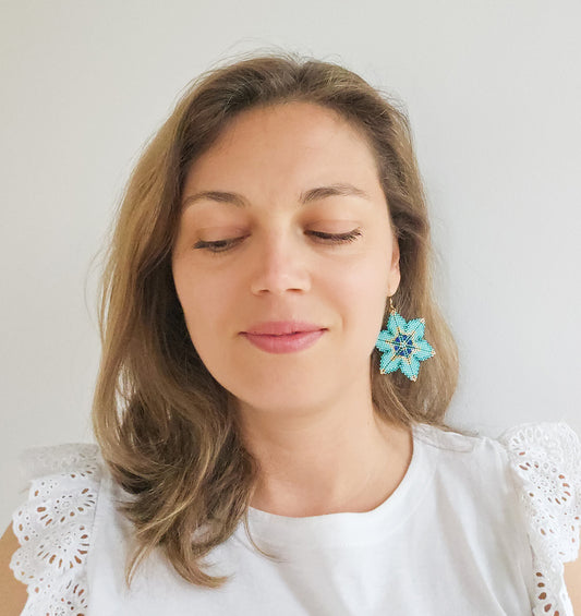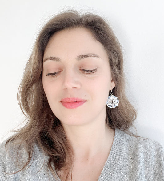 Cercei fulg de zapada din margele albe, bleu si argintii