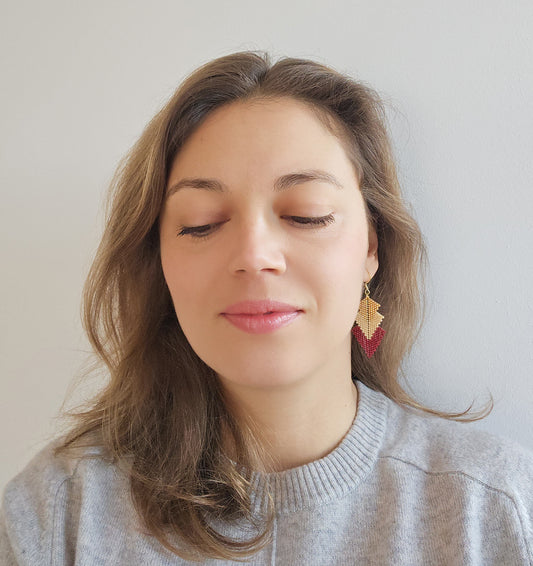 Cercei geometrici lungi auriu, crem si rosu inchis
