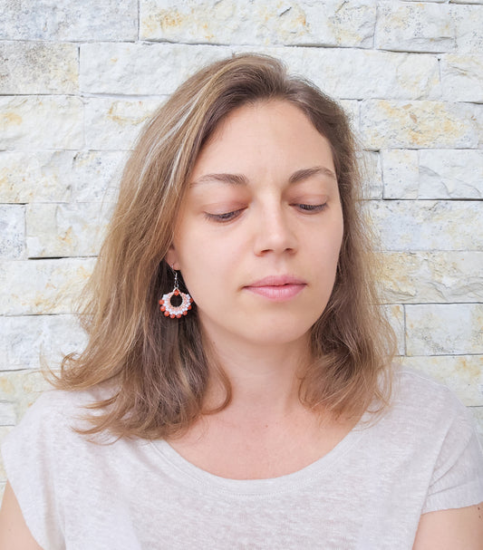 Cercei evantai din margele coral si albe