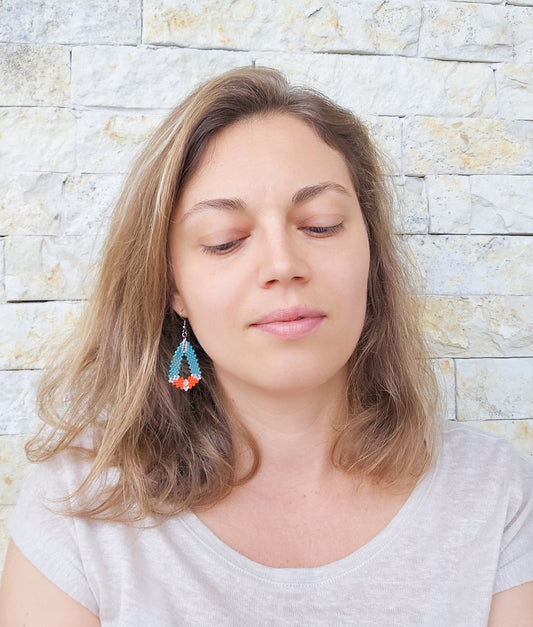 Cercei geometrici din margele turcoaz si portocalii