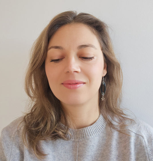 Cercei negri lungi in forma de frunza cu stele argintii