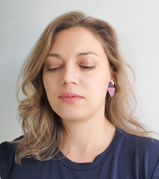 Cercei triunghiulari din margele mov pruna si roz prafuit