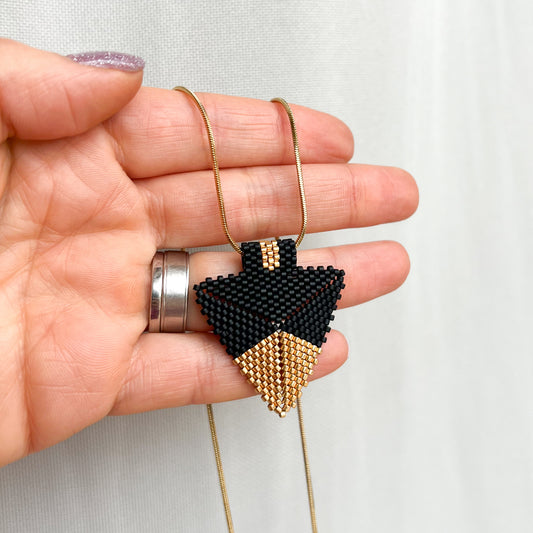 Colier modern cu pandantiv triunghiular din margele negre si aurii