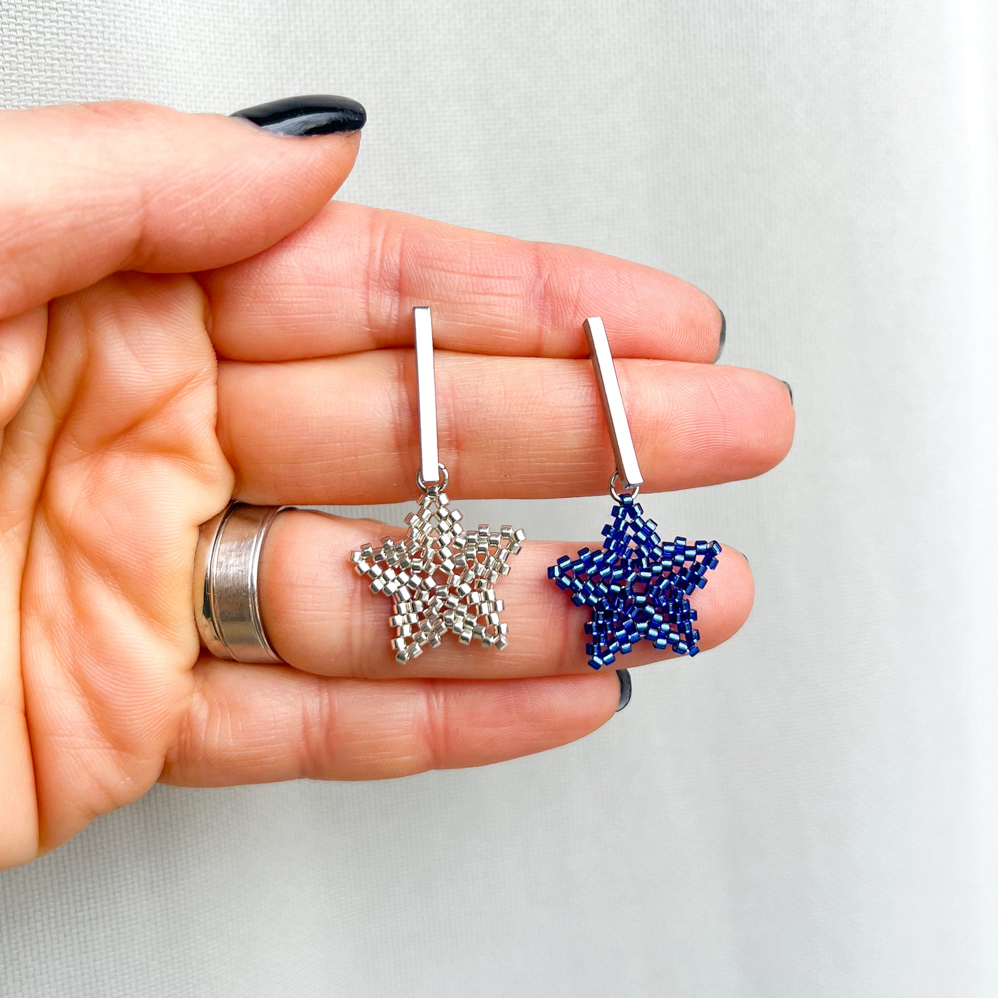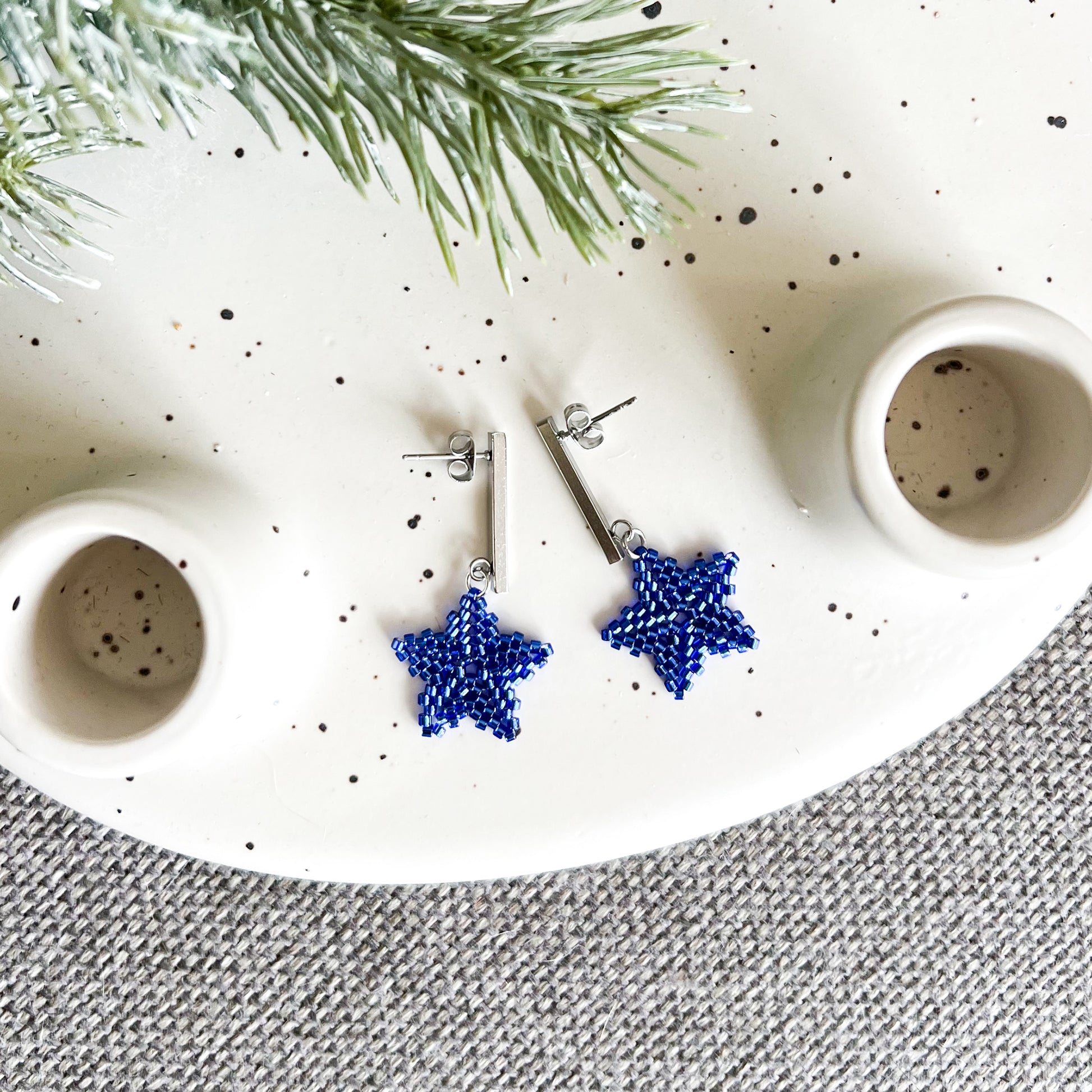 Cercei cu steluta din margele albastru cobalt stralucitor tesuti din margele de sticla Miyuki Delica pe fir de nailon