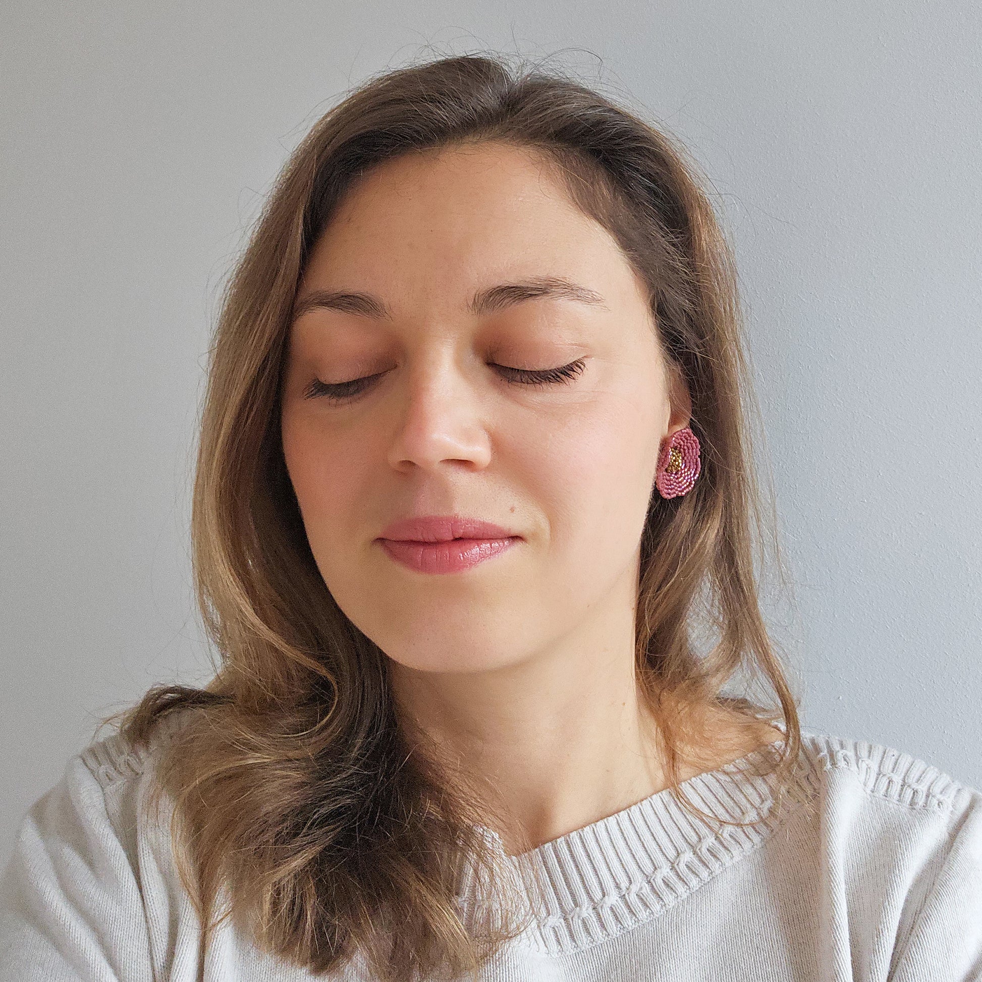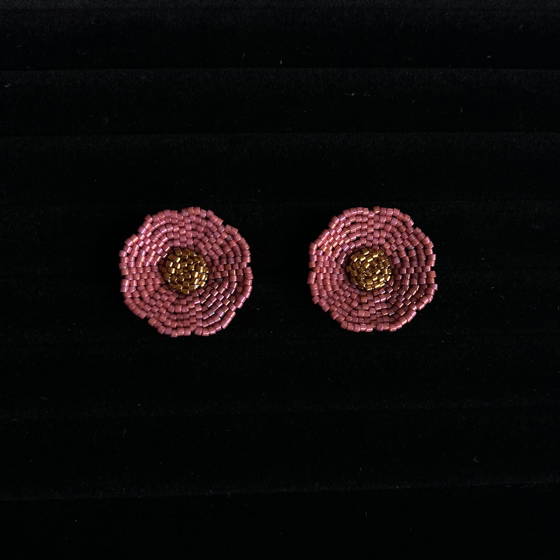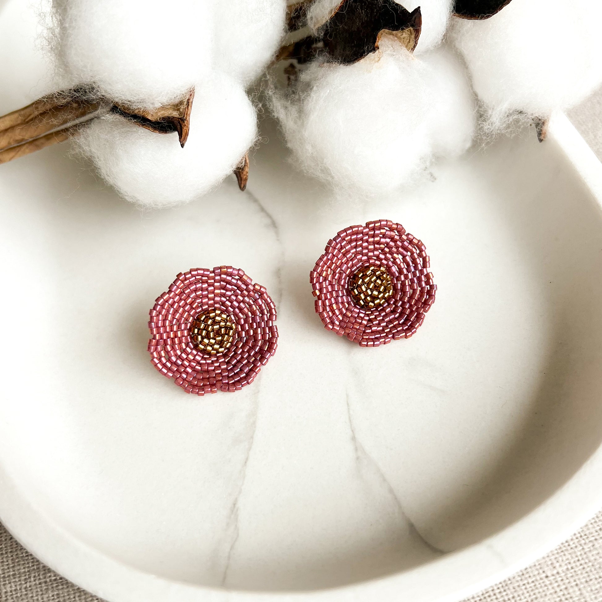 Cercei cu surub in forma de floare din margele roz pudrat cu auriu tesuti din margele de sticla Miyuki Delica pe fir de nailon