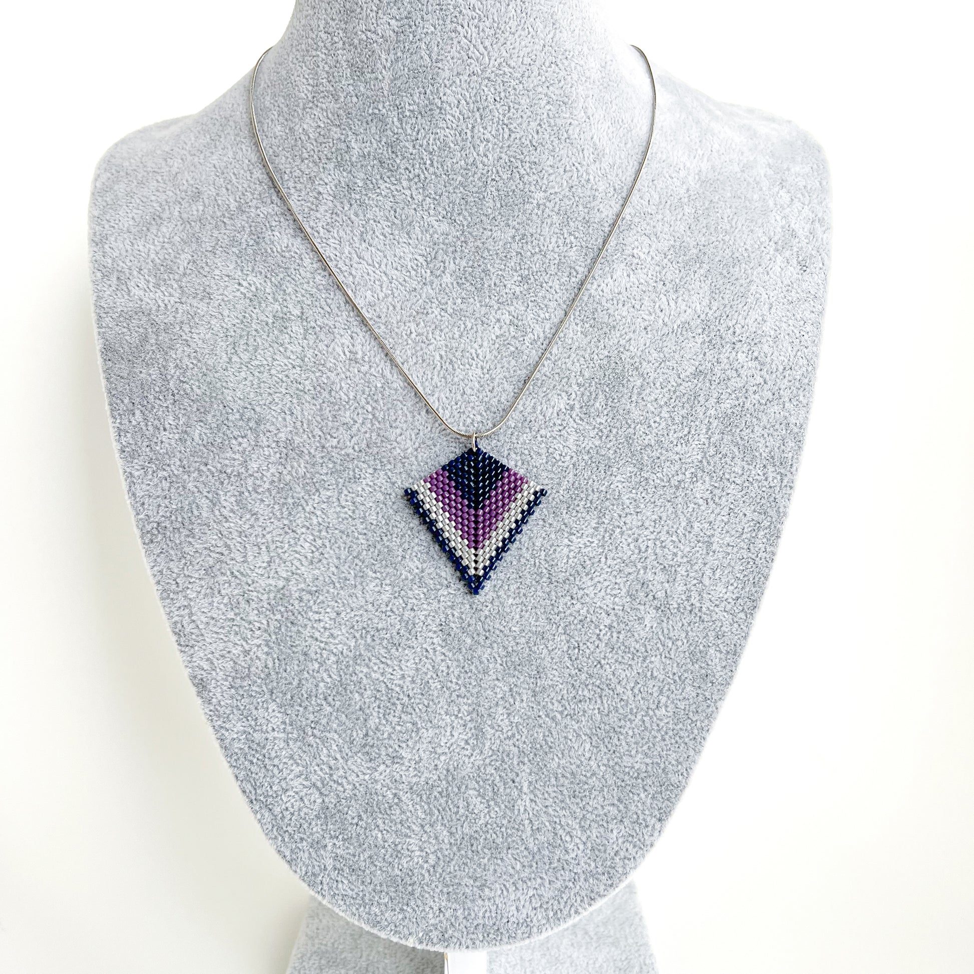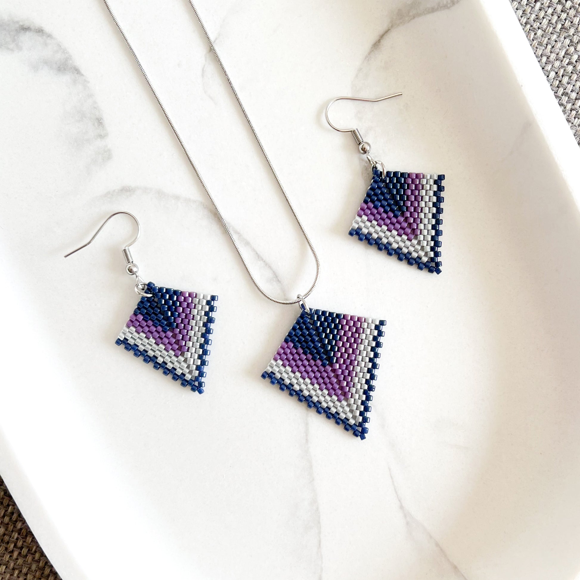 Cercei geometrici si pandantiv din margele mov, bleumarin si gri argintiu tesuti din margele de sticla Miyuki Delica pe fir de nailon