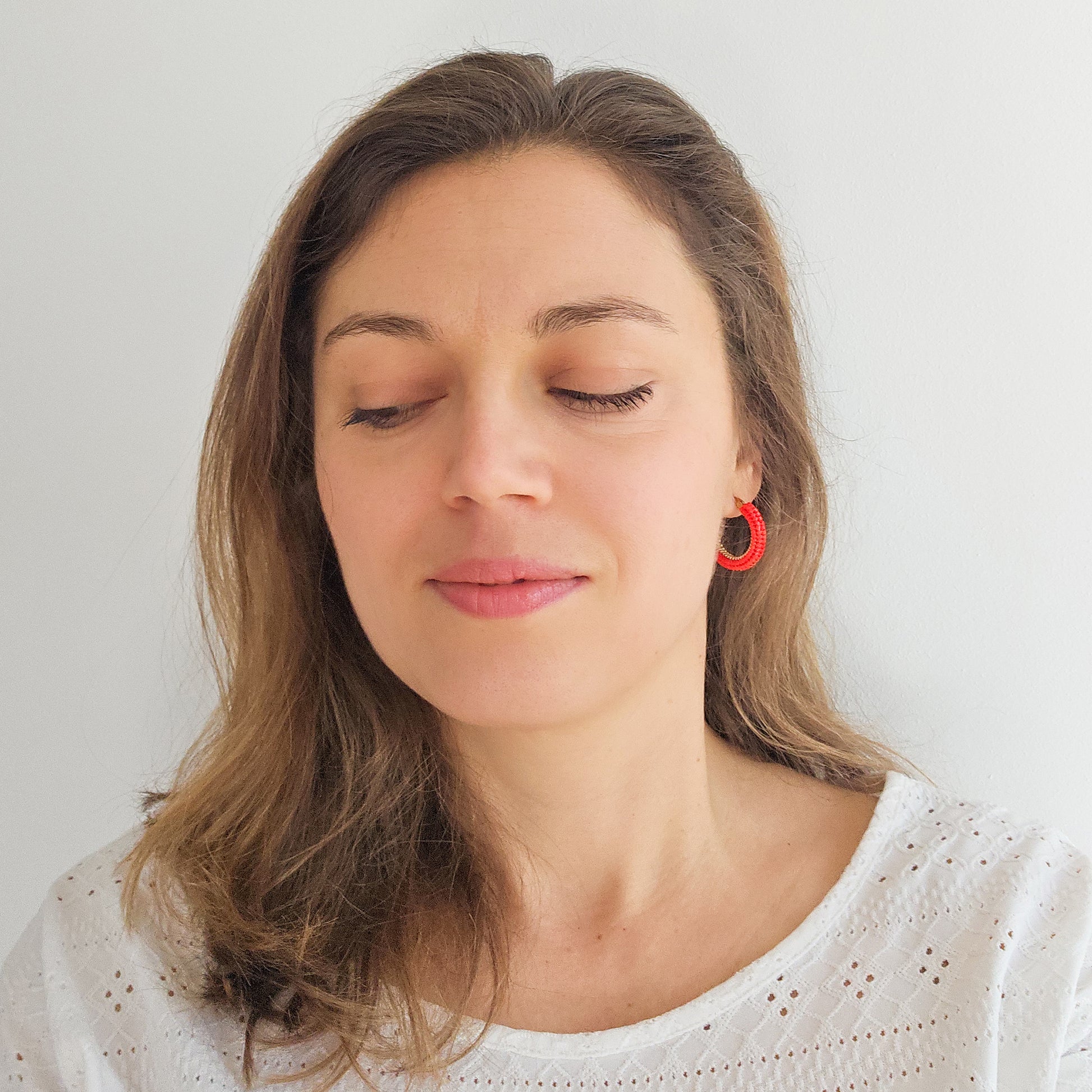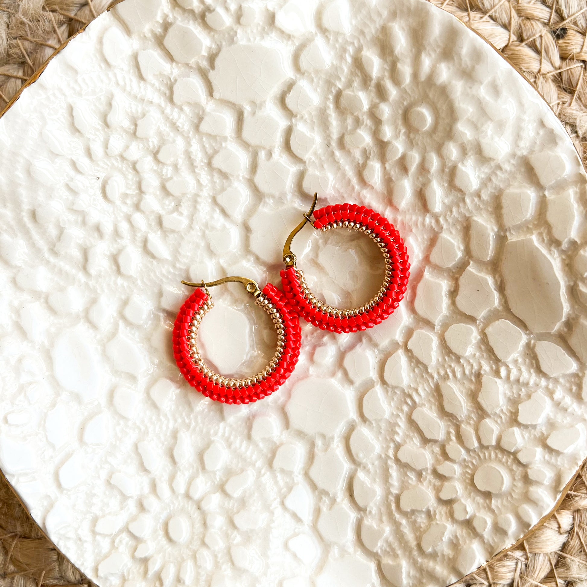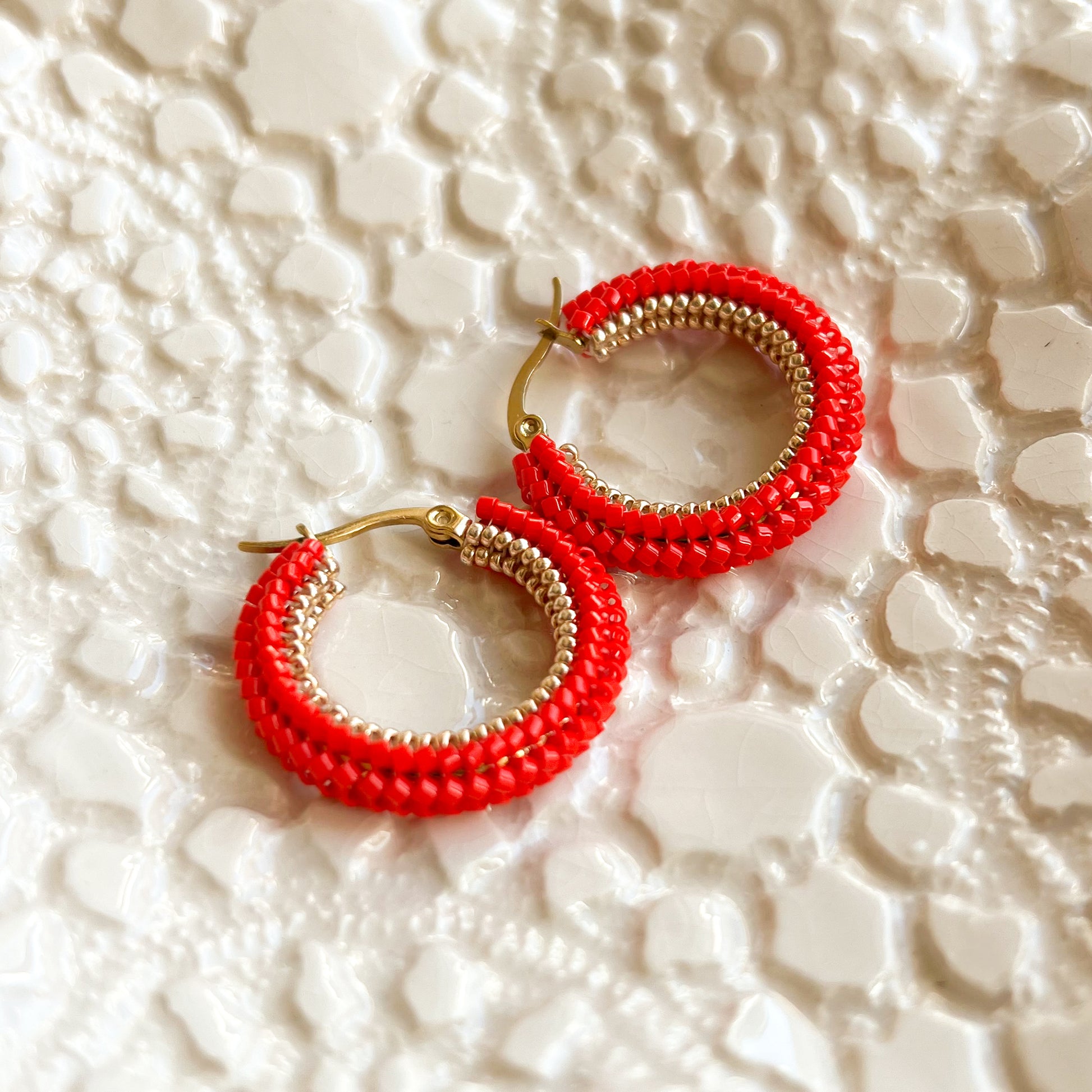 Cercei hoops mici din margele rosu aprins si aurii tesuti din margele de sticla Miyuki Delica pe fir de nailon