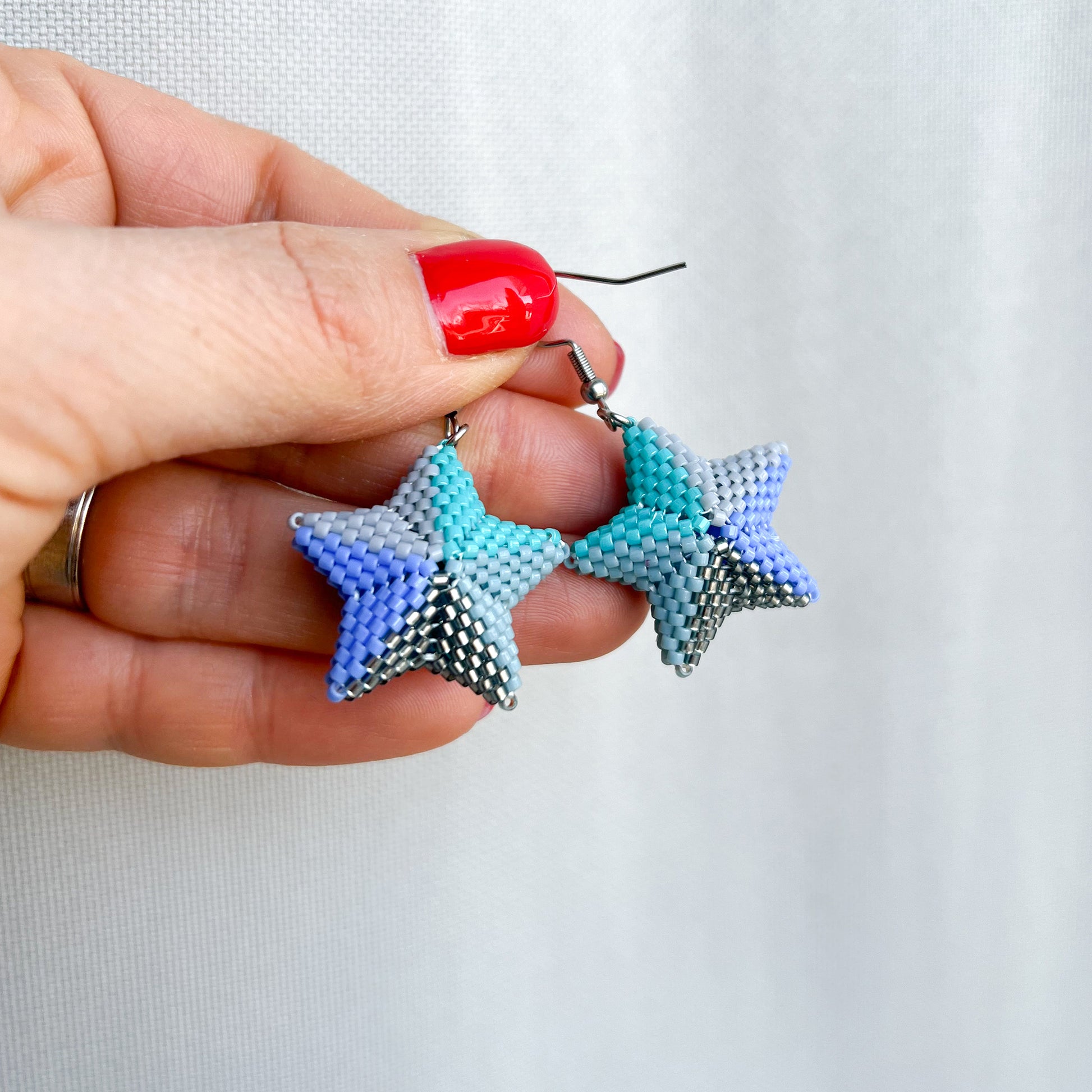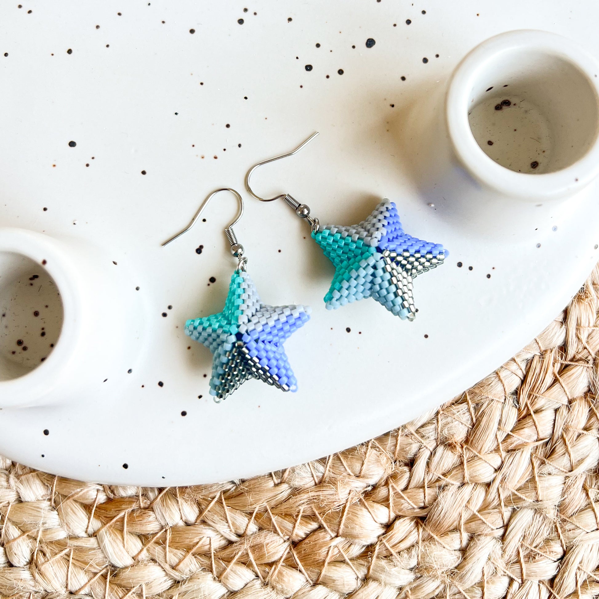 Cercei stea 3D din margele albastre, turcoaz si gri; stelutele sunt tesute din margele de sticla Miyuki Delica pe fir de nailon si sunt tridimensionale