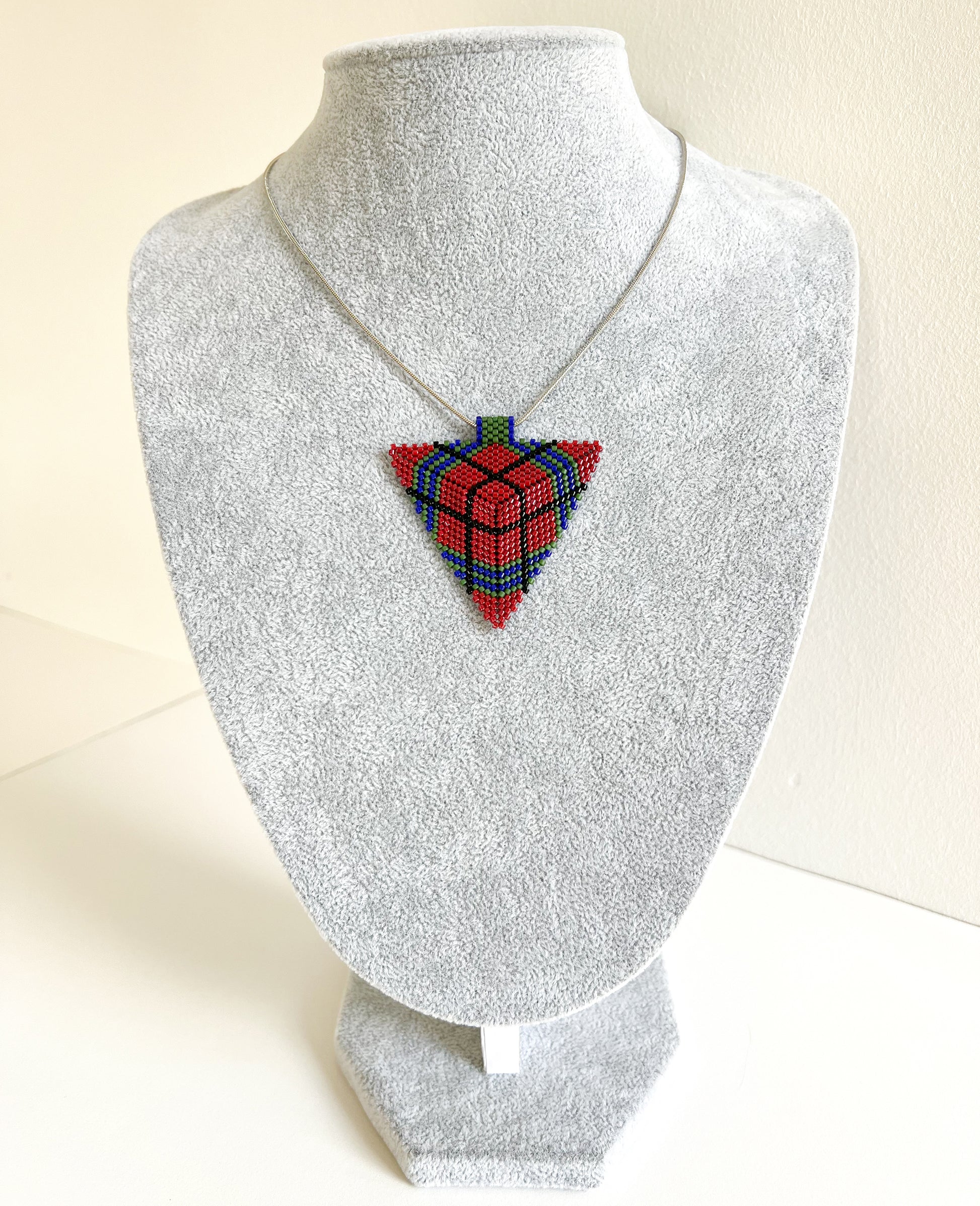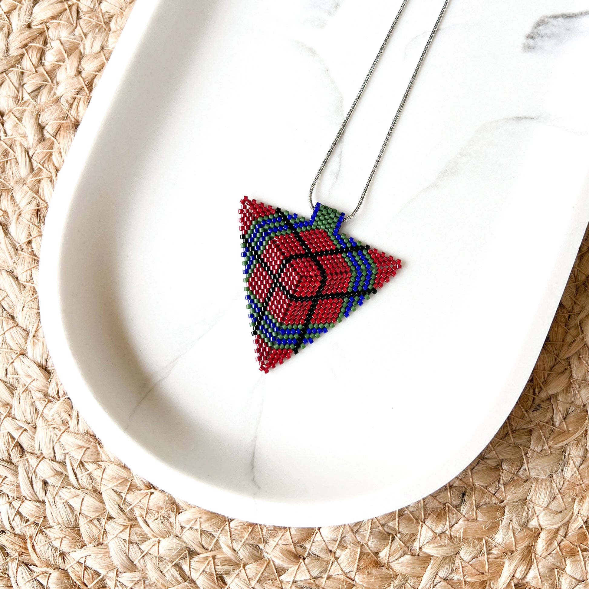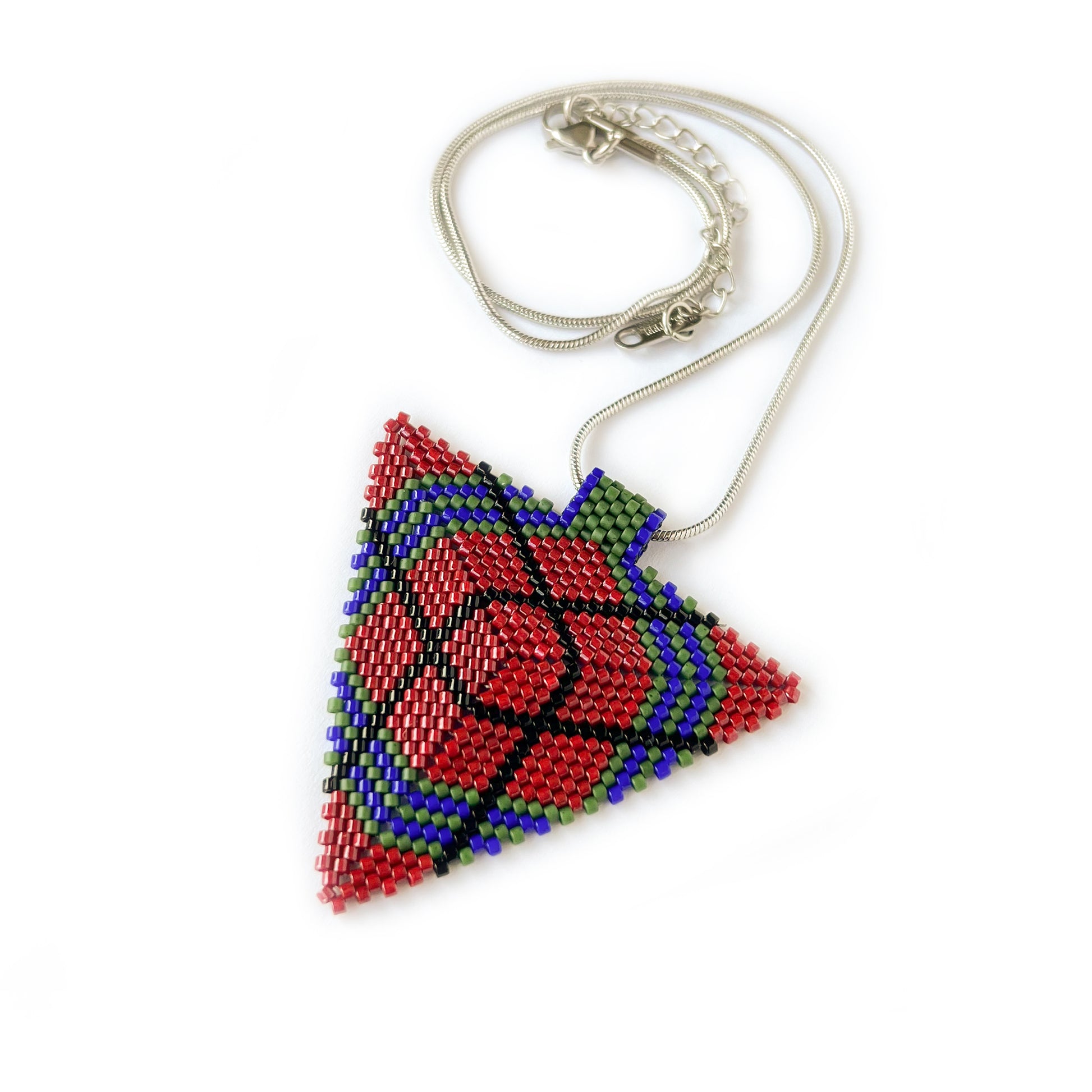 Colier cu pandantiv trunghiular cadrilat visiniu tesut din margele de sticla Miyuki Delica pe fir de nailon
