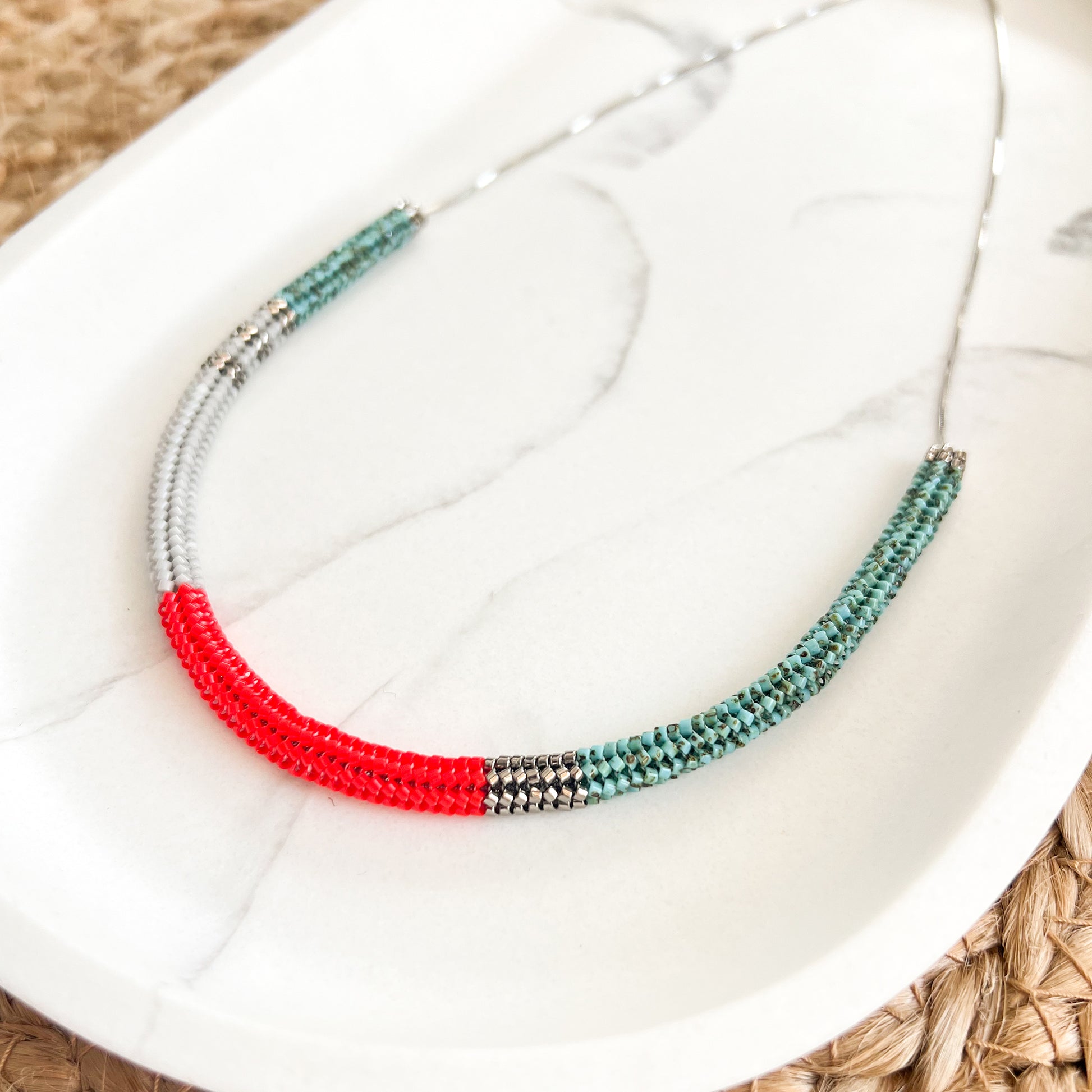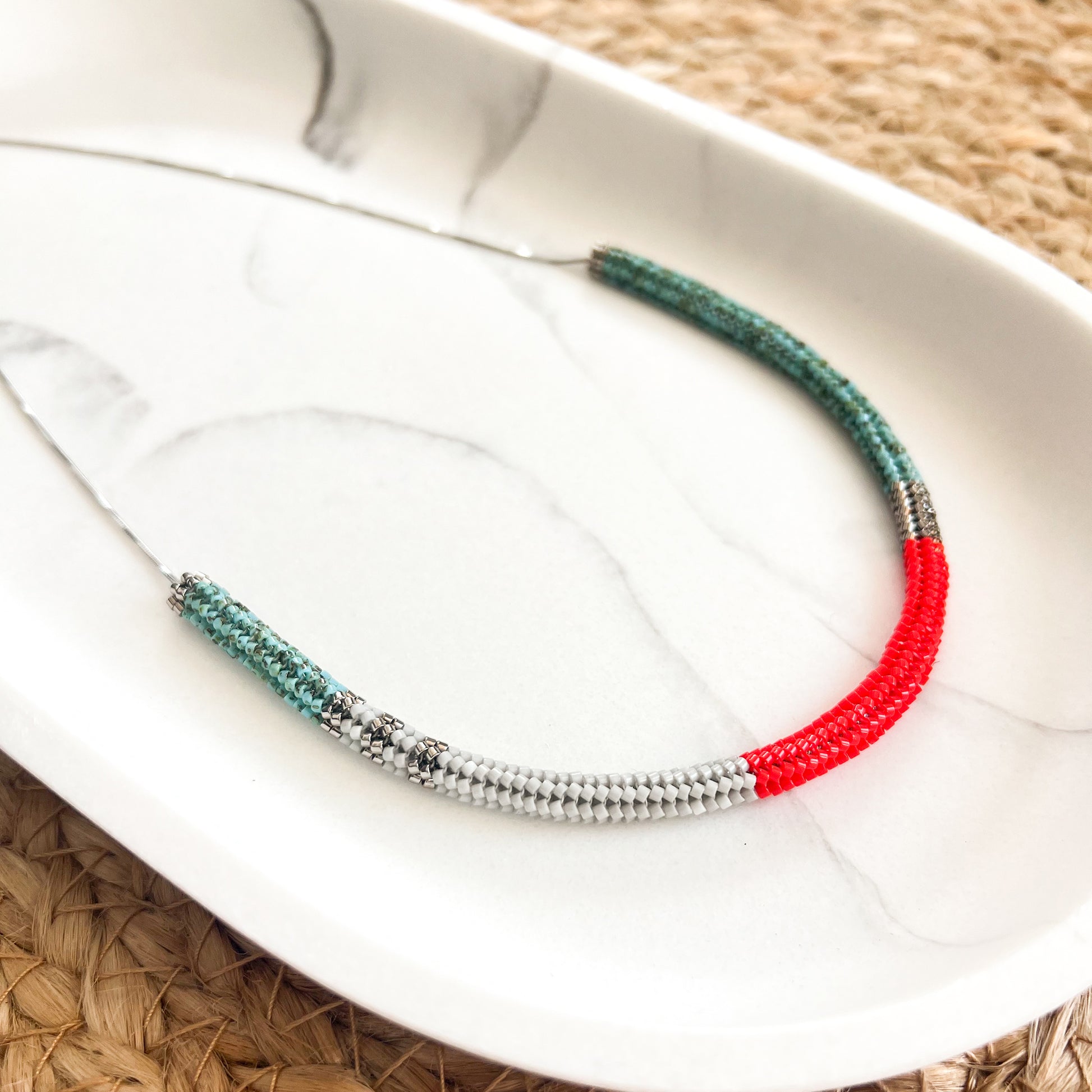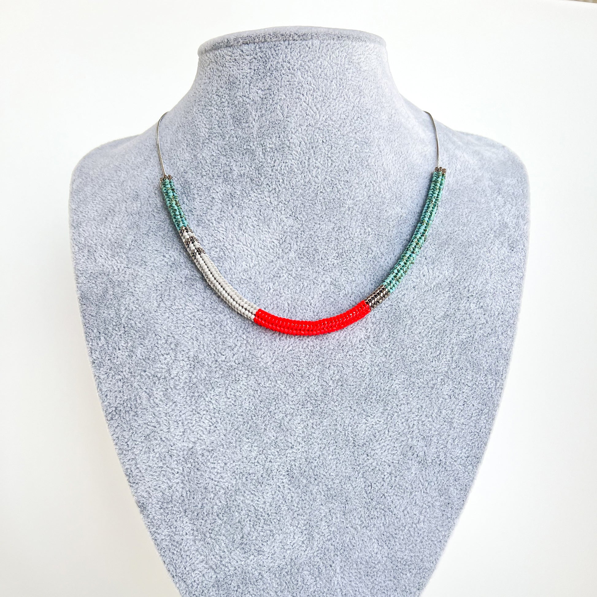 Colier minimalist la baza gatului din margele turcoaz, argintii, gri si rosu portocaliu