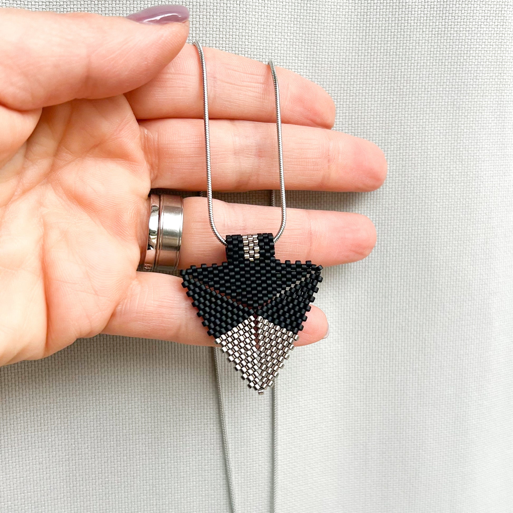 Colier modern cu pandantiv triunghiular din margele negre si argintii tesut din margele de sticla Miyuki Delica pe fir de nailon
