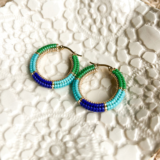 Cercei hoops medii din margele verzi, albastre si aurii