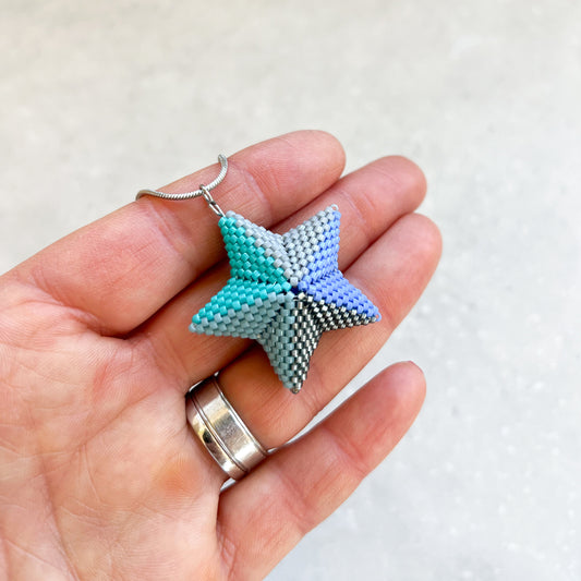 Colier lung cu pandantiv stea din margele albastre, turcoaz si gri